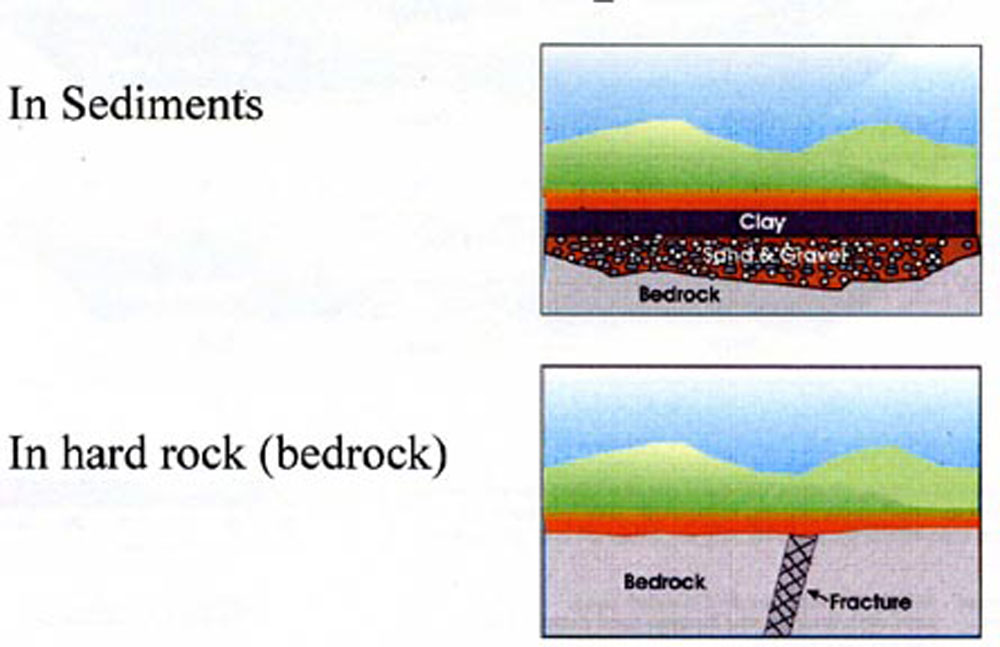 Groundwater exploration examples illustrate four conceptual aquifers, or models, that describe how groundwater occurs in the region. Water occupying the pore space between particles of sand, gravel, pebbles, and boulders is extremely common. Water in fractures or faults in hard rock (often granite bedrock) is a second situation also commonly encountered by rural water users.